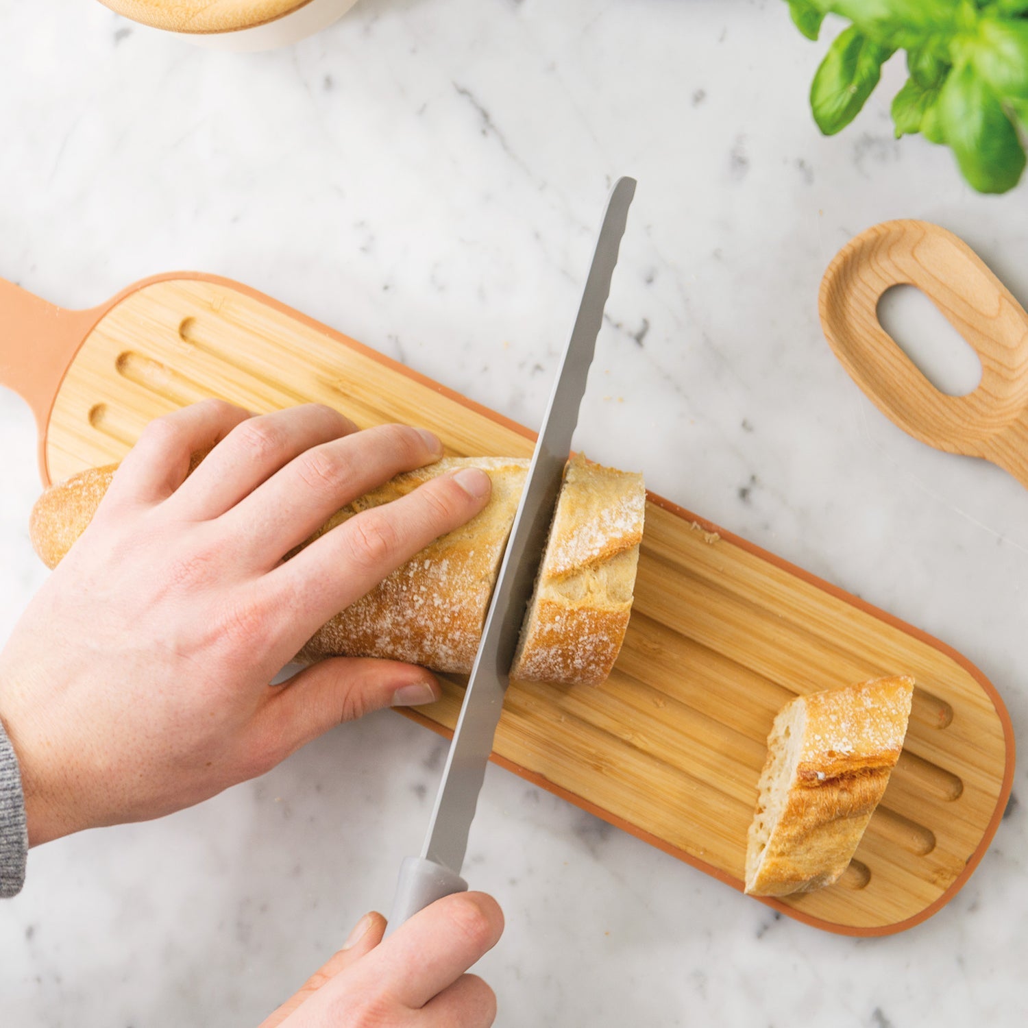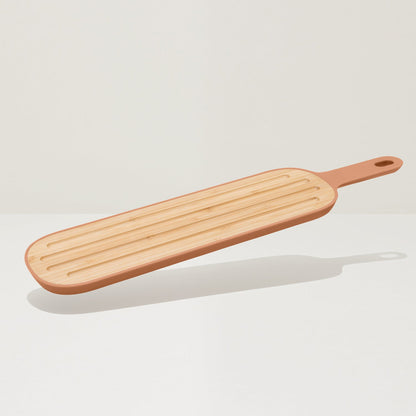 The long chopping board from the Leo collection is made of strong bamboo wood and is perfect for cutting a baguette or French bread. The slotted cutting surface ensures that the breadcrumbs do not end up all over your worktop. Are you looking for a stylish tray for your aperitif snacks? Thanks to the long handle with integrated loop, you can easily take the cutting board from the kitchen to the dining table!