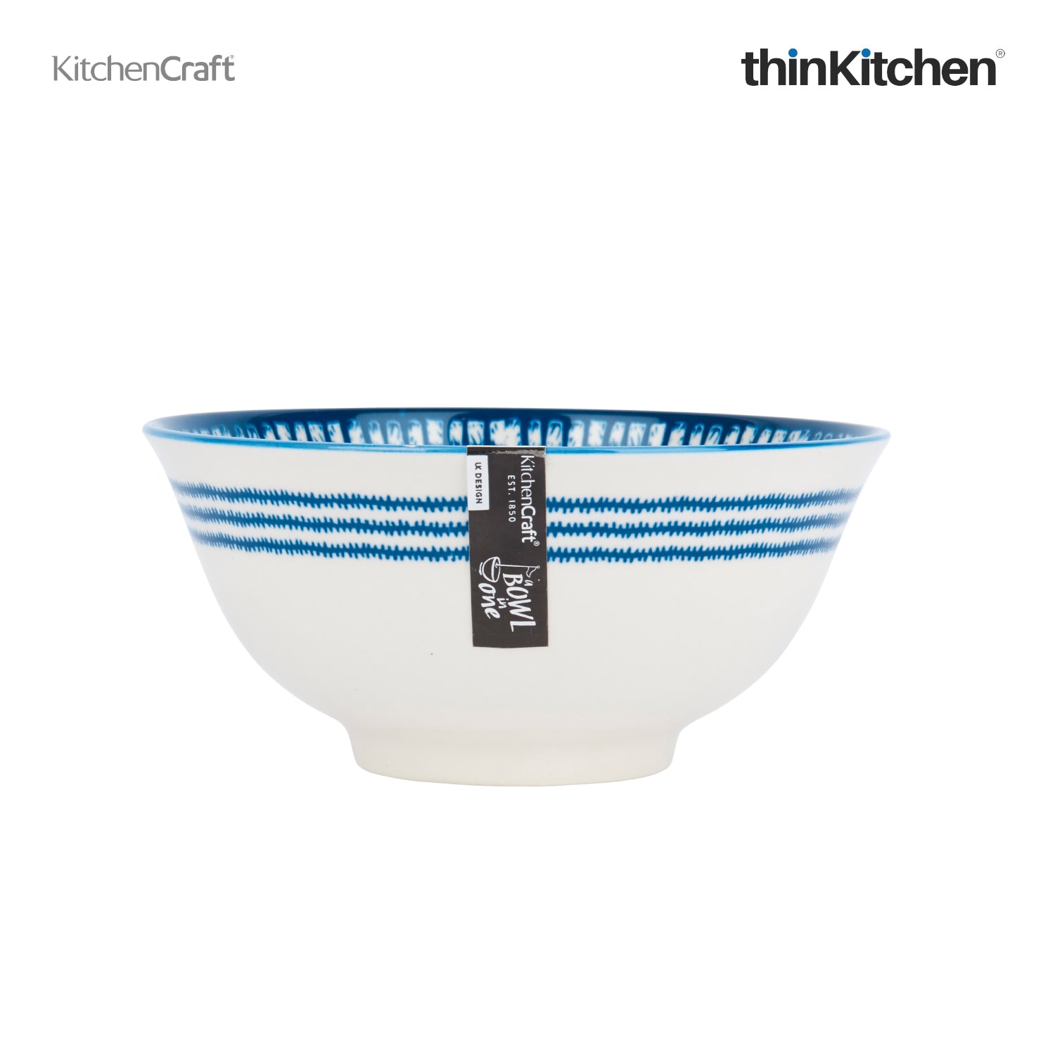 This KitchenCraft Glazed Stoneware Bowl features a bold blue tiled design inside the bowl with Greek style blue stripe at the top of the bowl outside. The perfect size for individual servings of porridge, soup, noodles and pie, these bowls are ideal for daily use at meal and snack times. With their generously wide rim, you can also use these bowls to serve up sides of salad and vegetables or generous helpings of dip. If you’re planning a dinner party, their creative, colourful appearance makes them ideal for presenting delicious tapas dishes for sharing with friends, and they’ll instantly brighten up the table for any buffet or BBQ spread. The footed base give the bowls extra height and means that any hot contents will stay at a safe distance from your surfaces.